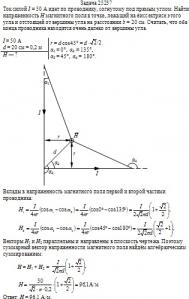 Ток силой I = 50 А идет по проводнику, согнутому под прямым углом. Найти напряженность Н магнитного поля в точке, лежащей на биссектрисе этого угла и отстоящей от вершины угла на расстоянии b = 20 см. Считать, что оба конца проводника находятся очень далеко от вершины угла.