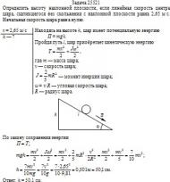 Определить высоту наклонной плоскости, если линейная скорость центра шара, скатившегося без скольжения с наклонной плоскости равна 2,65 м/с. Начальная скорость шара равна нулю.