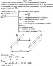 Скорость самолета при посадке ν = 360 км/ч. Определить разность потенциалов, возникающую на концах крыльев самолета, если вертикальная составляющая индукции магнитного поля Земли равна В = 50 мкТл, а размах крыльев самолета