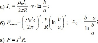 . На расстояниях a и b от него расположены два параллельных ему неизолированных провода, закороченных на одном конце сопротивлением R. Все три провода лежат в одной плоскости. По закороченным сопротивлением проводам скользит со скоростью v замыкающий их стержень 3—4. Определить: а) силу I и направление тока в контуре 1—2—3—4, б) силу F, необходимую, чтобы поддерживать постоянной скорость стержня 3—4, и расстояние х