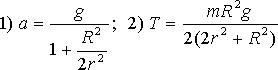 Для демонстрации законов сохранения применяется маятник Максвелла, представляющий собой массивный диск радиусом R и массой m, туго насаженный на ось радиусом r, которая подвешивается на двух предварительно намотанных на нее нитях. Когда маятник отпускают, то он совершает возвратно-поступательное движение в вертикальной плоскости при одновременном движении диска вокруг оси. Не учитывая силы сопротивления и момент инерции оси, определите: 1) ускорение поступательного движения маятника; 2) силу натяжения нити.