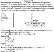 На стеклянную пластинку (n = 1,5) нанесен тонкий слой прозрачного вещества с показателем преломления n' = 1,3. На пластинку (со стороны покрытия) по нормали падает пучок монохроматического света с длиной волны λ = 600 нм. При какой минимальной толщине покрытия отраженный свет будет максимально ослаблен вследствие интерференции?