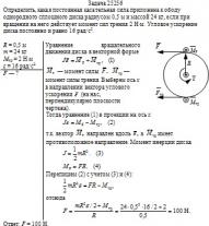 Определить, какая постоянная касательная сила приложена к ободу однородного сплошного диска радиусом 0,5 м и массой 24 кг, если при вращении на него действует момент сил трения 2 Н·м. Угловое ускорение диска постоянно и равно 16 рад/с