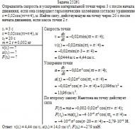 Определить скорость и ускорение материальной точки через 3 с после начала движения, если она совершает гармонические колебания согласно уравнению x = 0,02cos(πt+π/4), м. Найти силу, действующую на точку через 20 с после начала движения, если масса точки 2 г.