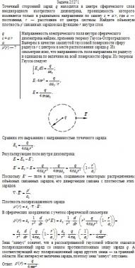Точечный сторонний заряд q находится в центре сферического слоя неоднородного изотропного диэлектрика, проницаемость которого изменяется только в радиальном направлении по закону ε = a/r, где а — постоянная, r — расстояние от центра системы. Найдите объемную плотность ρ' связанных зарядов как функцию r внутри слоя.