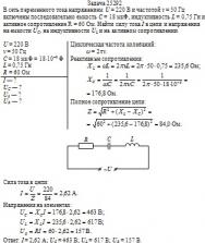 В сеть переменного тока напряжением U = 220 В и частотой ν = 50 Гц включены последовательно емкость С = 18 мкФ, индуктивность L = 0,75 Гн и активное сопротивление R = 60 Ом. Найти силу тока I в цепи и напряжения на емкости U