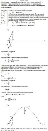 = 15 м/с под углом α = 45° к горизонту. Определить скорость тела, нормальное и тангенциальное ускорение, радиус кривизны траектории в начальный момент и в верхней точке траектории.