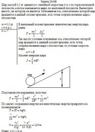 Шар массой 0,5 кг движется с линейной скоростью 4 м/с по горизонтальной плоскости, а потом вкатывается вверх по наклонной плоскости. Вычислите высоту, на которую он вкатится. Мгновенная ось, относительно которой шар вращается в данный момент времени, есть точка соприкосновения шара с плоскостью.