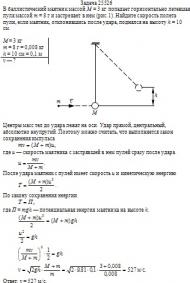 В баллистический маятник массой М = 3 кг попадает горизонтально летевшая пуля массой m = 8 г и застревает в нем (рис.1). Найдите скорость полета пули, если маятник, отклонившись после удара, поднялся на высоту h = 10 см.