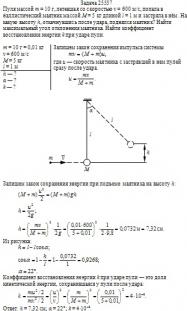 Пуля массой m = 10 г, летевшая со скоростью v = 600 м/с, попала в баллистический маятник массой M = 5 кг длиной l = 1 м и застряла в нём. На какую высоту h, откачнувшись после удара, поднялся маятник? Найти максимальный угол отклонения маятника. Найти коэффициент восстановления энергии k при ударе пули.