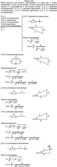 Найти формулы для полного сопротивления Z и сдвига фаз φ между напряжением и током при различных способах включения сопротивления R, емкости С и индуктивности L. Рассмотреть случаи: а) R и С включены последовательно; б) R и С включены параллельно; в) R и L включены последовательно; г) R и L включены параллельно; д) R, C и L включены последовательно.
