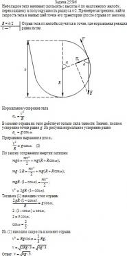 Небольшое тело начинает скользить с высоты h по наклонному желобу, переходящему в полуокружность радиуса h/2. Пренебрегая трением, найти скорость тела в наивысшей точке его траектории (после отрыва от желоба).
