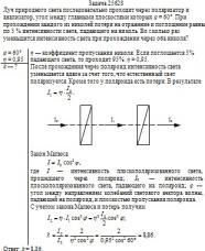 Луч природного света последовательно проходит через поляризатор и анализатор, угол между главными плоскостями которых φ = 60°. При прохождении каждого из николей потери на отражение и поглощение равны по 5 % интенсивности света, падающего на николь. Во сколько раз уменьшится интенсивность света при прохождении через оба николя?
