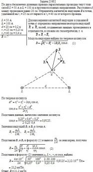 = 100 А в противоположных направлениях. Расстояние d между проводами равно 20 см. Определить магнитную индукцию В в точке, удаленной на r