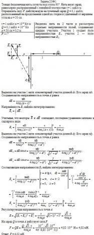 Тонкая бесконечная нить согнута под углом 90°. Нить несет заряд, равномерно распределенный с линейной плотностью τ = 1 мкКл/м. Определить силу F, действующую на точечный заряд Q = 0,1 мкКл, расположенный на продолжении одной из сторон и удаленный от вершины угла на a = 50 см.