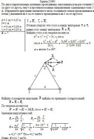 По двум параллельным длинным проводникам, находящимся на расстоянии 5 см друг от друга, текут в противоположных направлениях одинаковые токи 5 А. Определить индукцию магнитного поля, созданного этими проводниками в точке, удаленной на 4 см от одного проводника и на 3 см от другого.