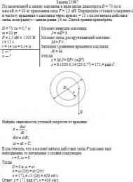 По касательной к шкиву маховика в виде диска диаметром D = 70 см и массой m = 20 кг приложена сила F = 1,5 кН. Определить угловое ускорение ε и частоту вращения n маховика через время t = 15 с после начала действия силы, если радиус r шкива равен 14 см. Силой трения пренебречь.