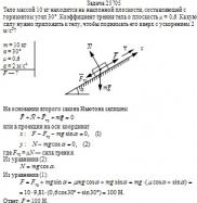 Тело массой 10 кг находится на наклонной плоскости, составляющей с горизонтом угол 30°. Коэффициент трения тела о плоскость μ = 0,6. Какую силу нужно приложить к телу, чтобы поднимать его вверх с ускорением 2 м/с