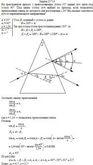 На трехгранную призму с преломляющим углом 50° падает луч света под углом 40°. Под каким углом луч выйдет из призмы, если показатель преломления стекла, из которого она изготовлена 1,54? На сколько сместится луч от первоначального направления?