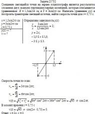 Смещение светящейся точки на экране осциллографа является результатом сложения двух взаимно перпендикулярных колебаний, которые описываются уравнениями: X = 1,5sin2πt см и Y = 3sin2πt см. Написать уравнение у(х) и построить траекторию светящейся точки, найти скорость точки для t = 0,75 с.