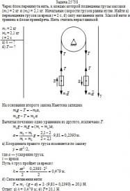 ) = 2,1 кг. Начальные скорости грузов равны нулю. Найти а) перемещение грузов за время t = 2 с, б) силу натяжения нити. Массой нити и трением в блоке пренебречь. Нить считать нерастяжимой.