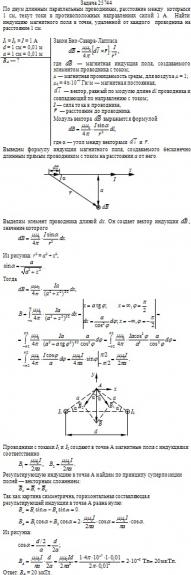 По двум длинным параллельным проводникам, расстояние между которыми 1 см, текут токи в противоположных направлениях силой 1 А. Найти индукцию магнитного поля в точке, удаленной от каждого проводника на расстояние 1 см.