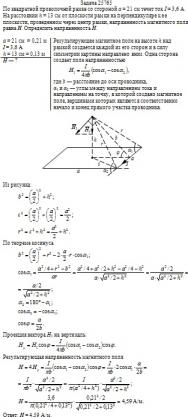 По квадратной проволочной рамке со стороной a = 21 см течет ток I = 3,6 А. На расстоянии h = 13 см от плоскости рамки на перпендикуляре к ее плоскости, проведенном через центр рамки, напряженность магнитного поля равна H. Определить напряженность H.