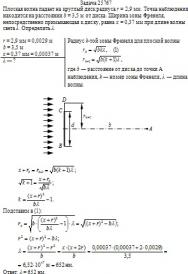 Плоская волна падает на круглый диск радиуса r = 2,9 мм. Точка наблюдения находится на расстоянии b = 3,5 м от диска. Ширина зоны Френеля, непосредственно примыкающая к диску, равна x = 0,37 мм при длине волны света λ. Определить λ.