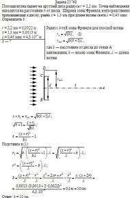 Плоская волна падает на круглый диск радиуса r = 2,2 мм. Точка наблюдения находится на расстоянии b от диска. Ширина зоны Френеля, непосредственно примыкающая к диску, равна x = 1,3 мм при длине волны света λ = 0,43 мкм. Определить b.