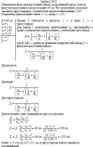 Определить фокусное расстояние линзы, погруженной в воду, если ее фокусное расстояние в воздухе равно 40 см. Что произойдет, если воду заменить сероуглеродом с показателем преломления равным 1,63? Показатель преломления стекла — 1,5, воды — 1,33.