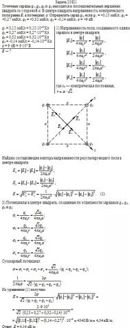 находятся в последовательных вершинах квадрата со стороной a. В центре квадрата напряженность электрического поля равна E, а потенциал φ. Определить заряд q