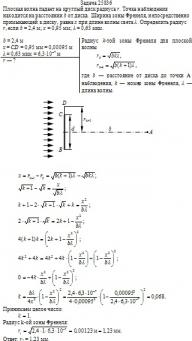Плоская волна падает на круглый диск радиуса r. Точка наблюдения находится на расстоянии b от диска. Ширина зоны Френеля, непосредственно примыкающей к диску, равна x при длине волны света λ. Определить радиус r, если b = 2,4 м; х = 0,95 мм; λ = 0,63 мкм.
