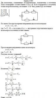 Два вольтметра, соединенных последовательно, подключены к источнику тока и показывают соответственно 8 В и 4 В. Если подключить к источнику только второй вольтметр, он покажет 10 В. Чему равна ЭДС источника?