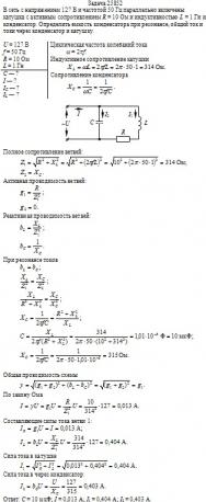 В сеть с напряжением 127 В и частотой 50 Гц параллельно включены катушка с активным сопротивлением R = 10 Ом и индуктивностью L = 1 Гн и конденсатор. Определить емкость конденсатора при резонансе, общий ток и токи через конденсатор и катушку.