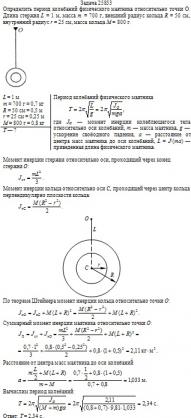 Определить период колебаний физического маятника относительно точки О. Длина стержня L = 1 м, масса m = 700 г, внешний радиус кольца R = 50 см, внутренний радиус r = 25 см, масса кольца М = 800 г.