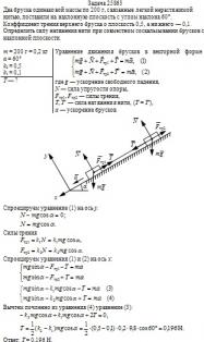 Два бруска одинаковой массы по 200 г, связанные легкой нерастяжимой нитью, поставили на наклонную плоскость с углом наклона 60°. Коэффициент трения верхнего бруска о плоскость 0,5, а нижнего — 0,1. Определить силу натяжения нити при совместном соскальзывании брусков с наклонной плоскости.
