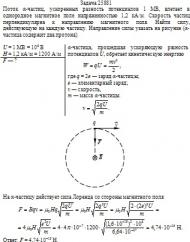 Поток α-частиц, ускоренных разностью потенциалов 1 МВ, влетает в однородное магнитное поле напряженностью 1,2 кА/м. Скорость частиц перпендикулярна к направлению магнитного поля. Найти силу, действующую на каждую частицу. Направление силы указать на рисунке (α-частица содержит два протона).