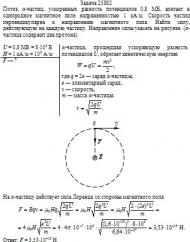 Поток α-частиц, ускоренных разностью потенциалов 0,8 МВ, влетает в однородное магнитное поле напряженностью 1 кА/м. Скорость частиц перпендикулярна к направлению магнитного поля. Найти силу, действующую на каждую частицу. Направление силы указать на рисунке. (α-частица содержит два протона).