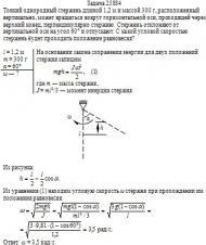 Тонкий однородный стержень длиной 1,2 м и массой 300 г, расположенный вертикально, может вращаться вокруг горизонтальной оси, проходящей через верхний конец, перпендикулярно стержню. Стержень отклоняют от вертикальной оси на угол 60° и отпускают. С какой угловой скоростью стержень будет проходить положение равновесия?