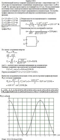 Колебательный контур содержит идеальную катушку с индуктивностью 150 мГн и два последовательно соединенных конденсатора с емкостями 2 мкФ и 4 мкФ. По катушке пропускается постоянный ток 250 мА. После отключения источника тока в контуре возникли гармонические колебания. Найдите уравнение колебаний для общего напряжения на конденсаторах. Постройте график зависимости электрической энергии в колебательном контуре от времени.