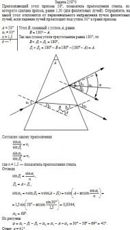Преломляющий угол призмы 58°, показатель преломления стекла, из которого сделана призма, равен 1,50 (для фиолетовых лучей). Определите, на какой угол отклонится от первоначального направления пучок фиолетовых лучей, если падение лучей происходит под углом 30° к грани призмы.