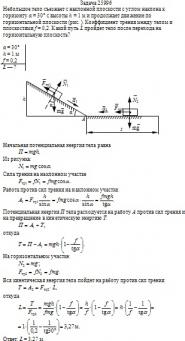 Небольшое тело съезжает с наклонной плоскости с углом наклона к горизонту α = 30° с высоты h = 1 м и продолжает движение по горизонтальной плоскости (рис. ). Коэффициент трения между телом и плоскостями f = 0,2. Какой путь L пройдет тело после перехода на горизонтальную плоскость?