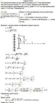 Плоская волна падает на круглый диск радиусом R. Точка наблюдения находится на расстоянии b = 1,6 м от диска. Ширина зоны Френеля, непосредственно примыкающей к диску, равна x = 0,35 мм при длине волны света λ = 0,69 мкм. Определить R.