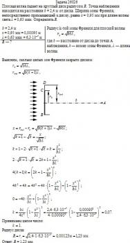 Плоская волна падает на круглый диск радиусом R. Точка наблюдения находится на расстоянии b = 2,4 м от диска. Ширина зоны Френеля, непосредственно примыкающей к диску, равна x = 0,95 мм при длине волны света λ = 0,63 мкм. Определить R.