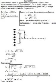 Плоская волна падает на круглый диск радиусом R = 3,5 мм. Точка наблюдения находится на расстоянии b = 1,7 м от диска. Ширина зоны Френеля, непосредственно примыкающей к диску, равна x = 0,13 мм при длине волны света λ = 0,49 мкм. Определить λ.