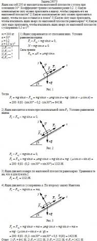 Ящик массой 200 кг находится на наклонной плоскости с углом при основании 30°. Коэффициент трения скольжения равен 0,2. 1) Какую минимальную силу нужно приложить к ящику, чтобы удержать его на наклонной плоскости? 2) Какую максимальную силу можно приложить к ящику, чтобы он еще оставался в покое? 3) Какую силу надо приложить, чтобы втаскивать ящик вверх по наклонной плоскости равномерно? 4) Какую силу надо приложить, чтобы втаскивать ящик вверх по наклонной плоскости с ускорением 0,5 м/с