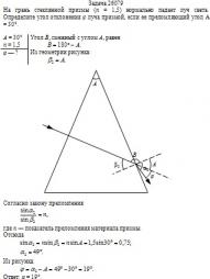На грань стеклянной призмы (n = 1,5) нормально падает луч света. Определите угол отклонения φ луча призмой, если ее преломляющий угол А = 30°.