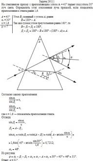 На стеклянную призму с преломляющим углом A = 45° падает под углом 30° луч света. Определить угол отклонения луча призмой, если показатель преломления n стекла равен 1,6.