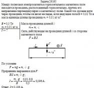 Между полюсами электромагнита в горизонтальном магнитном поле находится проводник, расположенный горизонтально, причем его направление перпендикулярно к магнитному полю. Какой ток должен идти через проводник, чтобы он висел не падая, если индукция поля В = 0,02 Тл и масса единицы длины проводника m