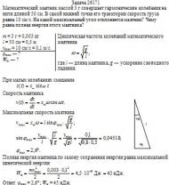 Математический маятник массой 3 г совершает гармонические колебания на нити длиной 50 см. В самой нижней точке его траектории скорость груза равна 10 см/с. На какой максимальный угол отклоняется маятник? Чему равна полная энергия этого маятника?